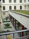 Der Neubauteil in Modulbauweise für den Personlaufenthaltsbereich und Bereitschaftsraum wurde im Innenhof angeordnet. Um ebenengleich anzuschließen wurden entsprechende Erdbewegungen nötig.
